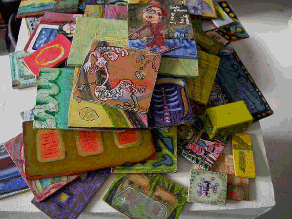 Roberta Fallon and Libby Rosof 48 Useful Paintings from the Useful Painting Series acrylic on panel, double-sided dimensions variable; 48 small paintings atop pedestal ongoing, beginning 2001