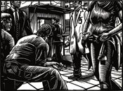 Here's the really exciting moment in the process - the pulling of the print! The inked block and the paper has been rolled through the press. The paper is carefully pulled from the block, and the artist gets his first look at the finished print.
