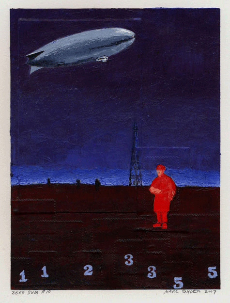 4B Faber-Castell pencil, 13 U.S. postage stamps, a postcard of a zeppelin, acrylic gel medium and acrylic paint on white heavyweight BFK Rives paper.