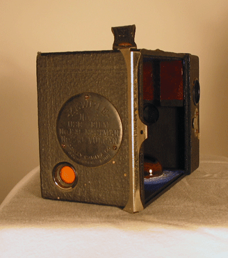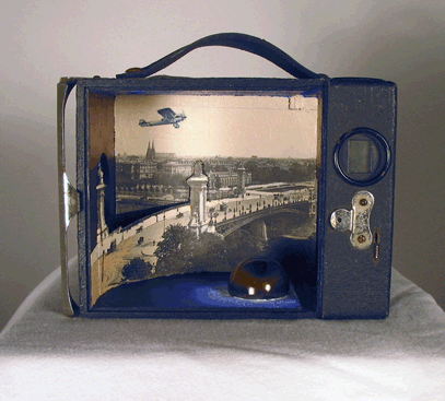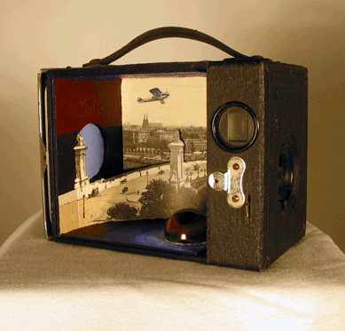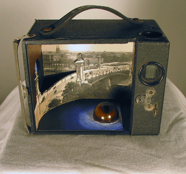 Kewpie #2 box camera, glass deer eye, vintage postcard of Paris, Spirit of St. Louis airmail stamp, acrylic paint